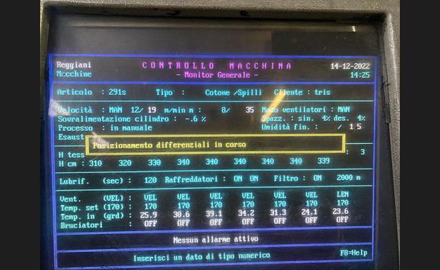 Description: REGGIANI Stenter model Reynold Process. Composed of E+L J-Box Accumulator at entry 3.400 mm working width, BETA Padder 3 rollers double bath. MAHLO weftstraightener with 6 optic. RFMC-10-AP W.W. 3.200 mm Year 2000. Stenter Working Width 3.400 mm. Year 1990. With E+L Introduction, 7 Chambers. Gas Heated. Pin/Clip chain. Automatyc clean filters. Individual encoder for regulation of width. Double Colloing zone. Non stop accumulator. MAHLO 4 optic, E+L Load cells at exit. Hygrometer for humidity control. Big Batcher for A-frame.