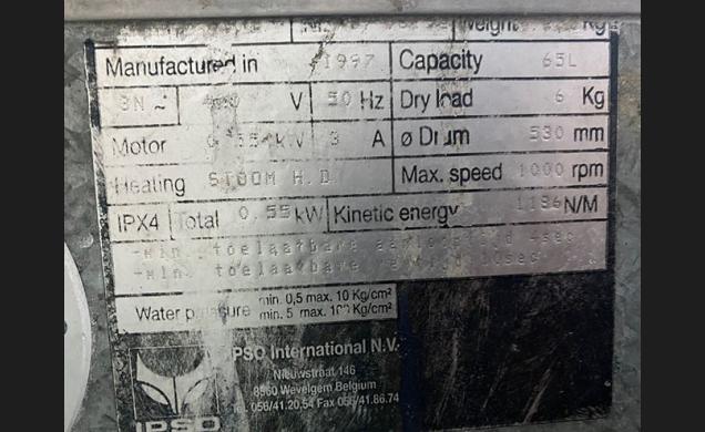 Descripción: Lavadora marca IPSO International modelo HF65, año 1997, diametro del cilindro 530mm, calefaccionda por vapor, capacidad 65 litros, capacidad tejido 6kg, 1000rpm