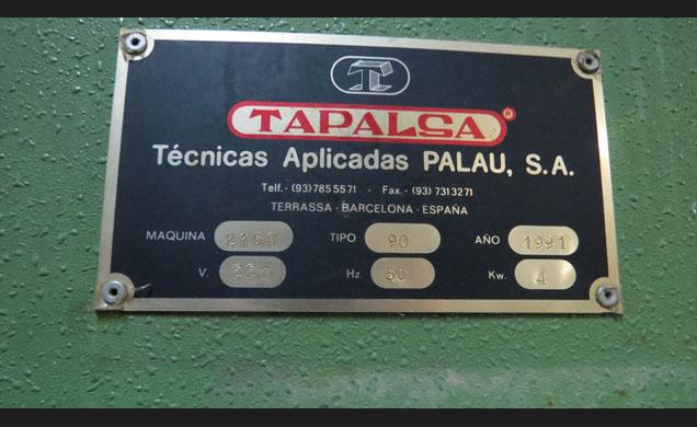Descripción: Empaquetadora marca TAPALSA. Nº 2168. Tipo 90. Año 1991. Ancho máximo 2.400 mm. Diametro de rollos 600 mm. Soldadura longitudinal y en cabezas. Cinta de descarga y Volquete de las piezas.