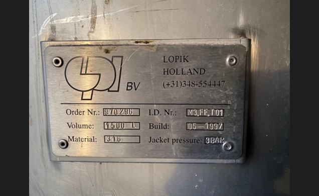 Descripción: LOPIK Tanque de mezcla en acero inoxidable 316 SS. Capacidad para 1.500 litros, preparado para agitador, apertura neumatica de la tapa. Desagüe inferior.
