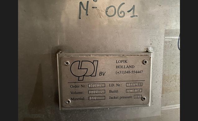 Descripción: LOPIK Tanque de mezcla en acero inoxidable 316 SS. Capacidad para 3.000 litros, preparado para agitador, apertura neumatica de la tapa. Desagüe inferior.